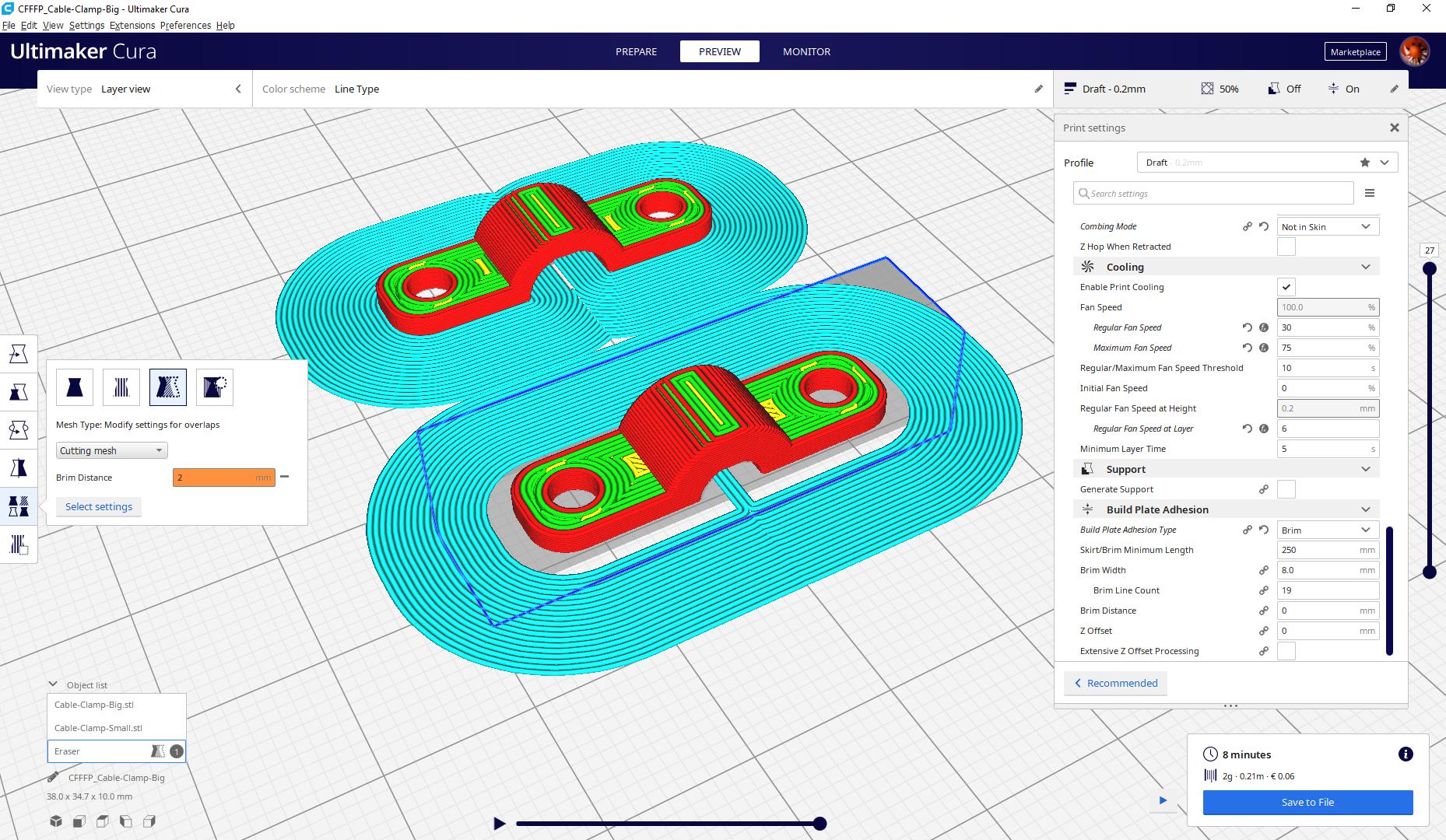 Lijsten Brim 3D Printing Cura. A brim prints on the first layer and surrounds the base of the model to reduce print defects. Printing a brim primes the printer nozzle, assists with bed adhesion, prevents model warping, and more. In cura, brim is a setting that instructs the printer to print multiple lines around the model for support. All you need to know. Oct 26, 2020 · the ultimaker cura provides setting options for build plate adhesion type.